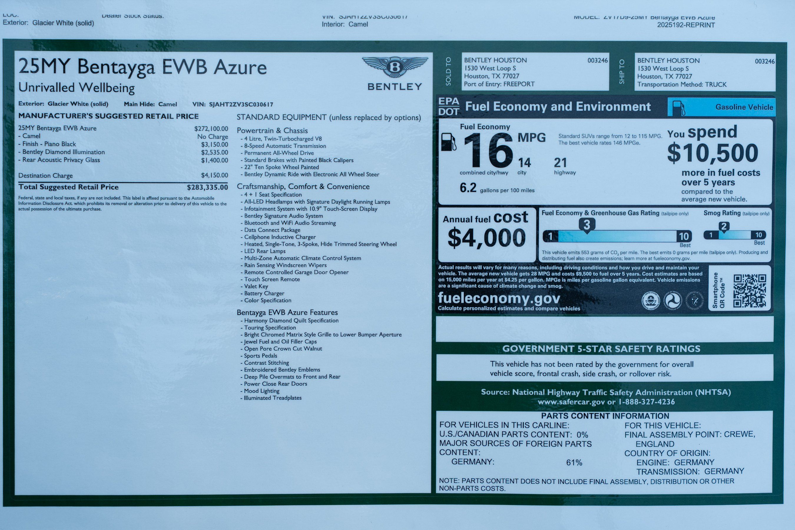 2025 Bentley Bentayga EWB Azure presented by Bentley Houston. Glacier White with Camel and Beluga interior, this Bentayga features Rear Acoustic Privacy Glass, Piano Black Finish, and Bentley Diamond Illumination. This vehicle has already received our premium Full-Front Paint Protection Film Package and Ceramic Coating treatment - an exclusive package professionally applied and included with your purchase.About Post Oak Motor Cars:Post Oak Motor Cars, a Fertitta Automotive Company, proudly represents Bentley, Rolls-Royce Motor Cars Houston, Bugatti, Karma, Lotus, Zenvo, Brabus, Hennessey, and Vintage Modern. Located in the prestigious Post Oak Complex in Uptown Houston, our flagship showroom offers an immersive luxury experience - surrounded by fine dining, designer fashion, luxury spa, and elegant accommodations. We also welcome you to our Lotus of The Woodlands showroom, located at 1501 Lake Robbins Drive. Our state-of-the-art service center and accessories boutique are supported by Certified Brand Representatives who can assist with: