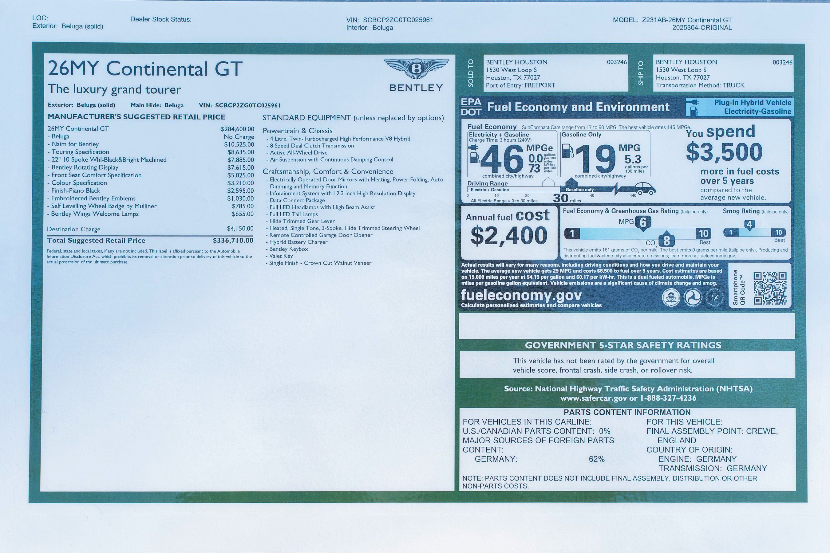2026 Bentley Continental GT presented by Bentley Houston. Beluga with Beluga and Gravity Grey interior, this GT features 22" 10-Spoke Wheels in Black & Bright Machined Finish with Self Levelling Wheel Badge by Mulliner, Bentley Wings Welcome Lamps, Touring Specification, Front Seat Comfort Specification, Colour Specification, Naim Premium Audio System for Bentley, Bentley Rotating Display, Veneer Finish in Piano Black and Embroidered Bentley Emblems to All Headrests. This vehicle has already received our premium Full-Front Paint Protection Film Package and Ceramic Coating treatment - an exclusive package professionally applied and included with your purchase. About Post Oak Motor Cars:Post Oak Motor Cars, a Fertitta Automotive Company, proudly represents Bentley, Rolls-Royce Motor Cars Houston, Bugatti, Karma, Lotus, Zenvo, Brabus, Hennessey, and Vintage Modern. Located in the prestigious Post Oak Complex in Uptown Houston, our flagship showroom offers an immersive luxury experience - surrounded by fine dining, designer fashion, luxury spa, and elegant accommodations. We also welcome you to our Lotus of The Woodlands showroom, located at 1501 Lake Robbins Drive. Our state-of-the-art service center and accessories boutique are supported by Certified Brand Representatives who can assist with: