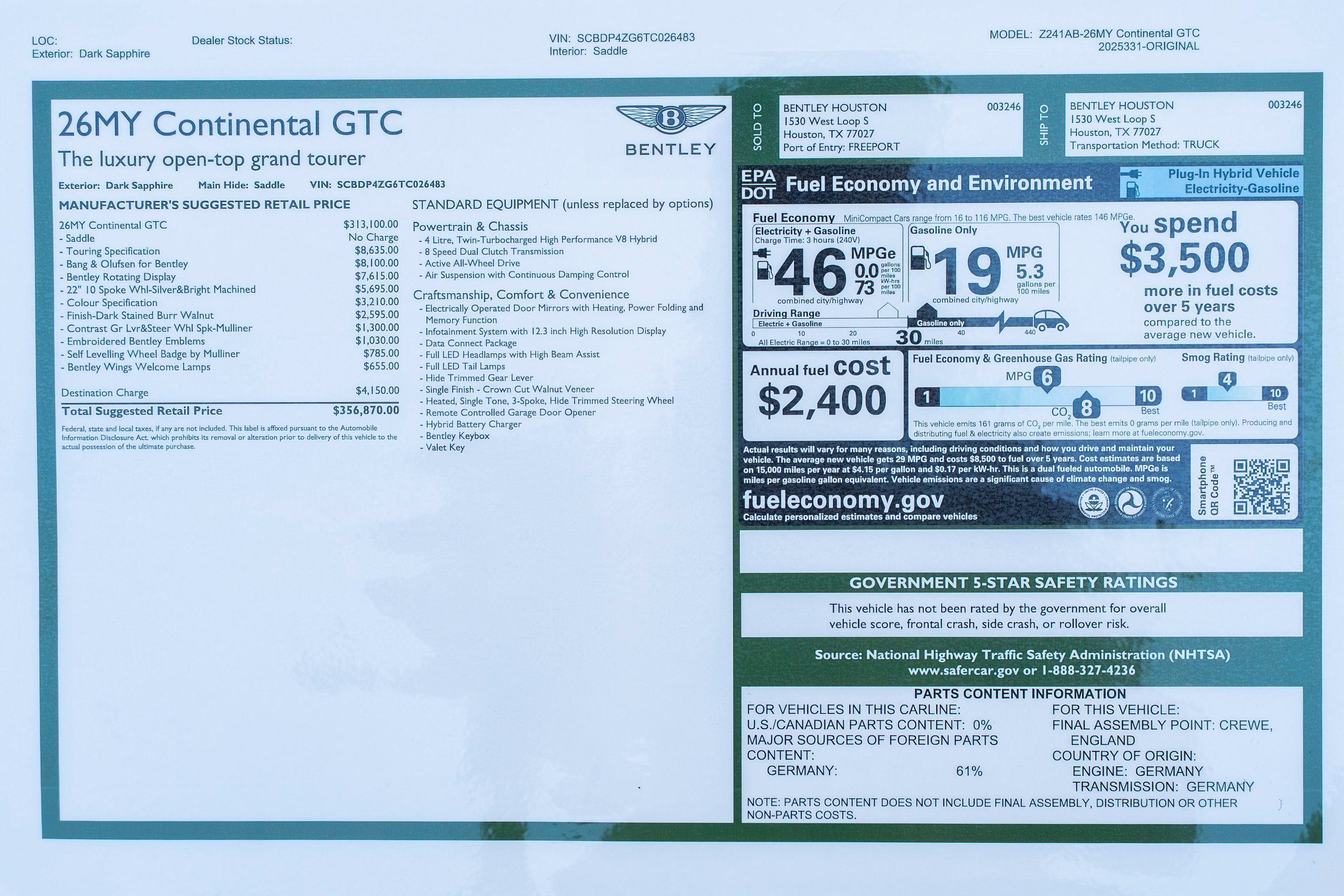 2026 Bentley Continental GTC presented by Bentley Houston. Dark Sapphire with Saddle and Imperial Blue interior, this GTC features 22" 10-Spoke Wheels in Silver & Bright Machined Finish with Self Levelling Wheel Badges by Mulliner, Bentley Wings Welcome Lamps, Colour Specification, Touring Specification, Bang & Olufsen Audio System for Bentley, Contrast Gear Lever & Steering Wheel Spokes by Mulliner, Veneer Finish in Dark Stained Burr Walnut, and Embroidered Bentley Emblems to All Headrests. About Post Oak Motor Cars:Post Oak Motor Cars, a Fertitta Automotive Company, proudly represents Bentley, Rolls-Royce Motor Cars Houston, Bugatti, Karma, Lotus, Zenvo, Brabus, Hennessey, and Vintage Modern. Located in the prestigious Post Oak Complex in Uptown Houston, our flagship showroom offers an immersive luxury experience - surrounded by fine dining, designer fashion, luxury spa, and elegant accommodations. We also welcome you to our Lotus of The Woodlands showroom, located at 1501 Lake Robbins Drive. Our state-of-the-art service center and accessories boutique are supported by Certified Brand Representatives who can assist with: