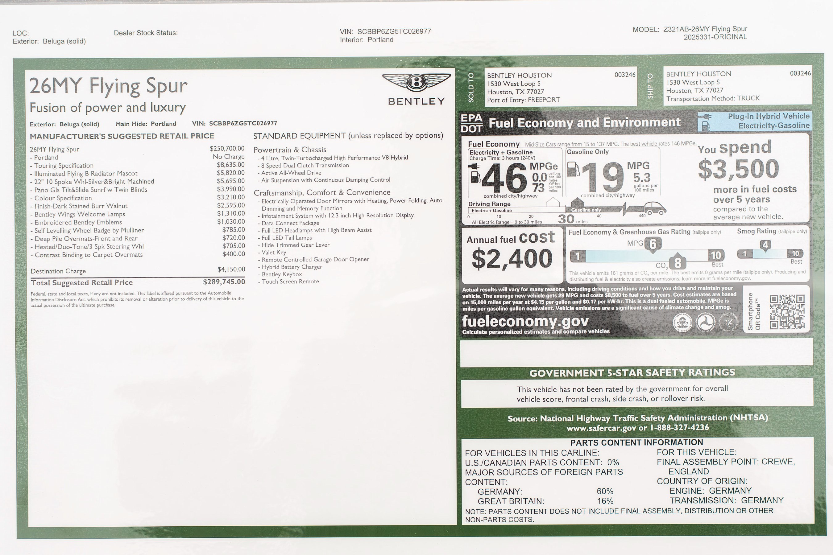 2026 Bentley Flying Spur presented by Bentley Houston. Beluga with Portland and Beluga interior, this Flying Spur features 22" 10-Spoke Wheels in Silver & Bright Machined Finish with Self Levelling Wheel Badges by Mulliner, Illuminated Flying B Radiator Mascot, Bentley Wings Welcome Lamps, Touring Specification, Colour Specification, Panoramic Glass Tilt & Slide Sunroof with Twin Blinds, Veneer Finish in Dark Stained Burr Walnut, Heated Duo-Tone 3-Spoke Steering Wheel, Embroidered Bentley Emblems to All Seats, Deep Pile Overmats to Front and Rear with Contrast Binding. This vehicle has already received our premium Ceramic Coating treatment - an exclusive package professionally applied and included with your purchase.About Post Oak Motor Cars:Post Oak Motor Cars, a Fertitta Automotive Company, proudly represents Bentley, Rolls-Royce Motor Cars Houston, Bugatti, Karma, Lotus, Zenvo, Brabus, Hennessey, and Vintage Modern. Located in the prestigious Post Oak Complex in Uptown Houston, our flagship showroom offers an immersive luxury experience - surrounded by fine dining, designer fashion, luxury spa, and elegant accommodations. We also welcome you to our Lotus of The Woodlands showroom, located at 1501 Lake Robbins Drive. Our state-of-the-art service center and accessories boutique are supported by Certified Brand Representatives who can assist with: