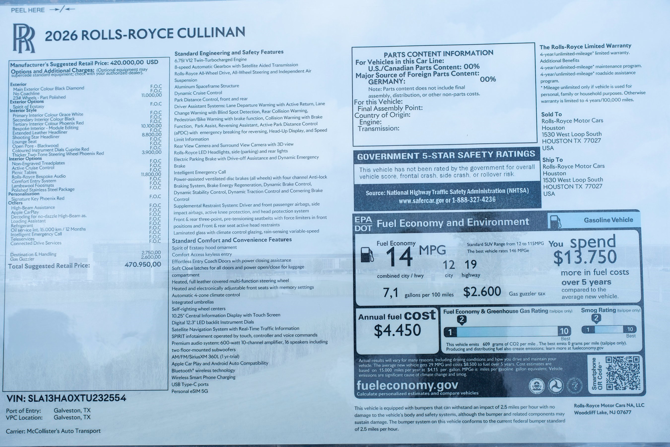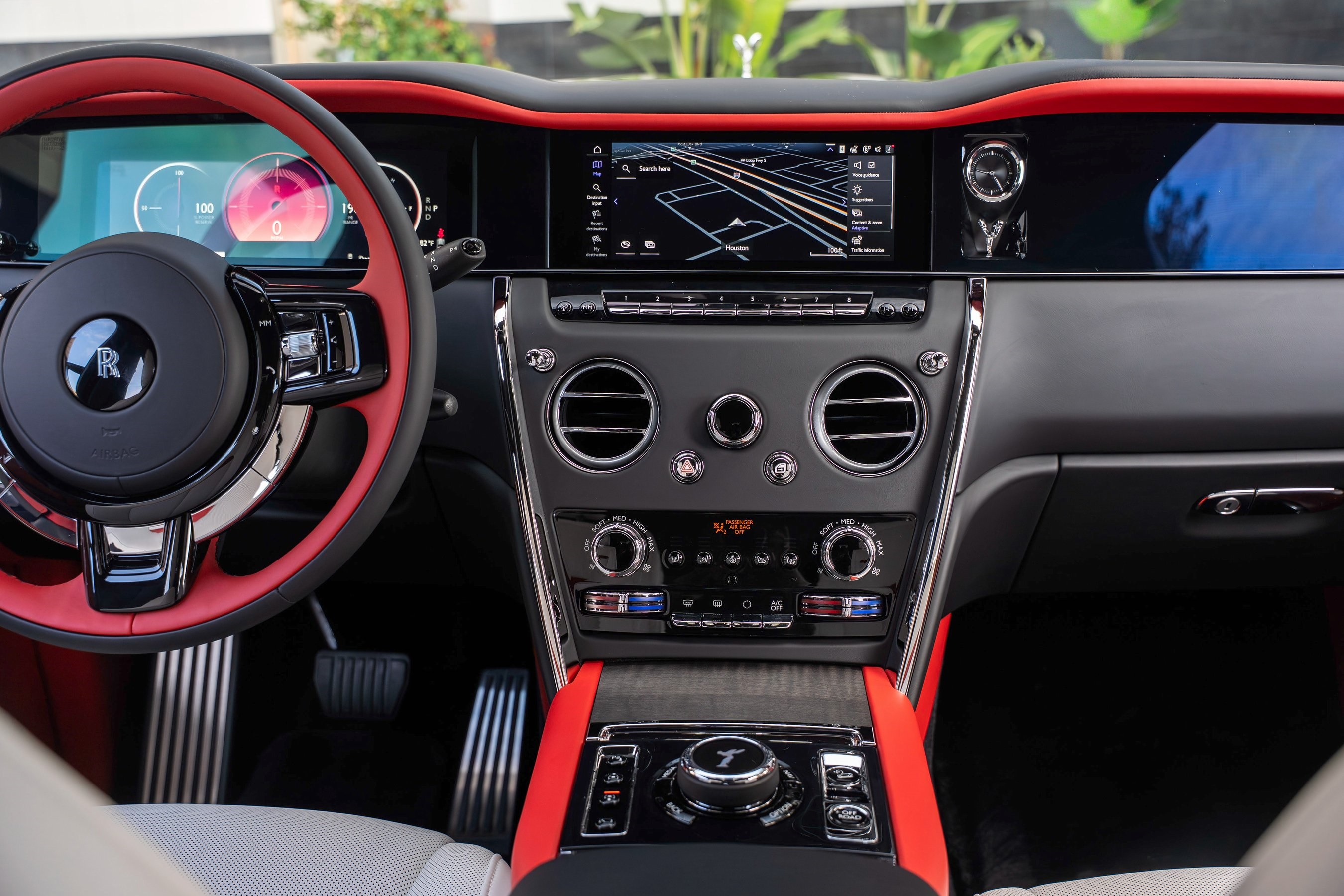 2026 Rolls-Royce Cullinan presented by Rolls-Royce Motor Cars Houston. Black Diamond with Grace White, Black and Phoenix Red interior, this Cullinan features 23 Wheels in Partial Polished Finish, Bespoke Interior - Module Editing, Shooting Star Headliner, Polished Stainless Steel Package, Thicker Two-Tone Steering Wheel in Phoenix Red and Black, Coloured Instrument Dials in Cuprite Red, RR Monogram to all Headrests in Phoenix Red, Rolls-Royce Bespoke Premium Audio System, Rear Privacy Glass, Lambswool Footmats in Black and a Signature Key in Phoenix Red Leather. This vehicle has already received our premium Ceramic Coating treatment - an exclusive package professionally applied and included with your purchase.The Post Oak Collection, a Post Oak Motor Cars company, is home to Bentley, Bugatti, Karma and Rolls-Royce Motor Cars Houston. Post Oak Motors is a lifestyle! We are headquartered in the elite Post Oak Complex in Uptown Houston, complete with elegant accommodations, high-end fashion, fine dining, luxury spa, and other sophisticated amenities. The Post Oak Collection The Woodlands is now open at the corner of Lake Robbins Drive and Woodloch Ct.Our dealership features a state-of-the-art service center, parts, and accessories boutiques along with Certified Brand Representatives that can assist you with any questions you may have about financing options, including Bitcoin and pricing details for this vehicle. Our team can also assist you with enclosed transportation and valuing your trade-in. Give us a call or simply come by the dealership for a test drive.