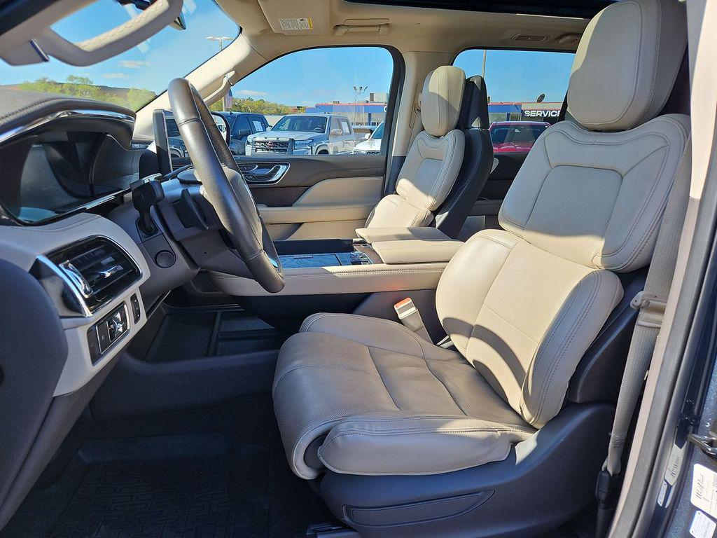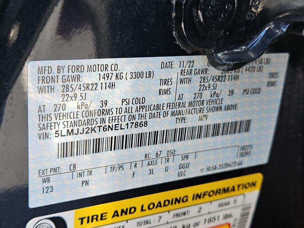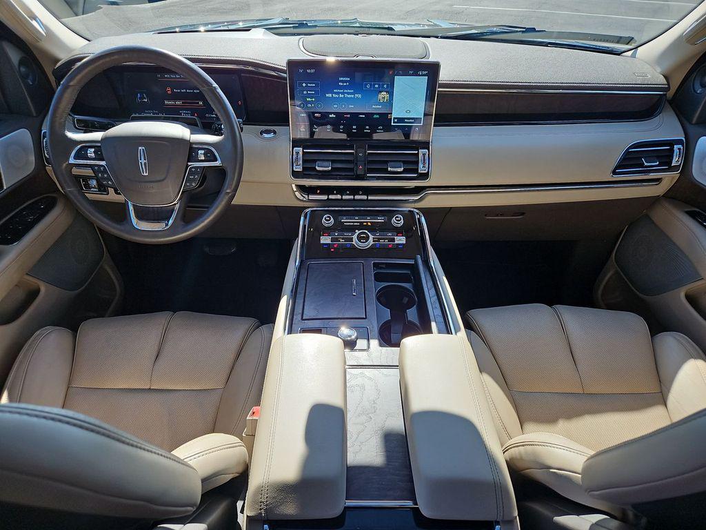 Blue Metallic 2022 Lincoln Navigator Reserve RWD 10-Speed Automatic V6 Sandstone Leather, 14 Speakers, 3.73 Axle Ratio, 3rd row seats: split-bench, 4-Wheel Disc Brakes, ABS brakes, Active Park Assist 2.0 Prep Kit, Adaptive suspension, Adjustable pedals, Air Conditioning, All-Weather Floor Liners w/Carpet Floor Mats, Alloy wheels, AM/FM radio: SiriusXM with 360L, Audio memory, Auto High-beam Headlights, Auto Start-Stop Technology, Auto tilt-away steering wheel, Auto-dimming door mirrors, Auto-dimming Rear-View mirror, Auto-leveling suspension, Automatic temperature control, Bodyside moldings, Brake assist, Bumpers: body-color, Compass, Delay-off headlights, Driver door bin, Driver vanity mirror, Driver's Seat Mounted Armrest, Dual front impact airbags, Dual front side impact airbags, Electronic Stability Control, Emergency communication system: 911 Assist, Equipment Group 201A Reserve I, Exterior Parking Camera Rear, Four wheel independent suspension, Front anti-roll bar, Front Bucket Seats, Front dual zone A/C, Front fog lights, Front License Plate Bracket, Front reading lights, Fully automatic headlights, Garage door transmitter, Genuine wood dashboard insert, Genuine wood door panel insert, Hands-Free Liftgate Delete, Head restraints memory, Heads-Up Display, Heated door mirrors, Heated front seats, Heated rear seats, Heated steering wheel, HVAC memory, Illuminated 1st & 2nd Row Seat Belts, Illuminated entry, Leather steering wheel, Lincoln Lit Star in Grille, Low tire pressure warning, Luxury Package, Memory seat, Navigation system: Connected Navigation (3-year trial), Occupant sensing airbag, Outside temperature display, Overhead airbag, Overhead console, Panic alarm, Passenger door bin, Passenger seat mounted armrest, Passenger vanity mirror, Pedal memory, Perfect Position Seats (30-Way) w/Active Motion, Power adjustable rear head restraints, Power door mirrors, Power driver seat, Power Liftgate, Power moonroof: Panoramic Vista Roof, Power passenger seat, Power steering, Power windows, Prem Lthr Auto Htd/Ventiltd Perfect Position Seats, Radio data system, Radio: Revel AM/FM/HD/MP3 Audio System, Rain sensing wipers, Rear air conditioning, Rear anti-roll bar, Rear audio controls, Rear reading lights, Rear window defroster, Rear window wiper, Reclining 3rd row seat, Remote keyless entry, Revel Ultima 3D Audio System w/28 Speakers, Roof rack: rails only, Security system, SiriusXM w/360L, Speed control, Speed-sensing steering, Speed-Sensitive Wipers, Split folding rear seat, Spoiler, Steering wheel memory, Steering wheel mounted audio controls, SYNC 4 Communications & Entertainment System, Tachometer, Telescoping steering wheel, Tilt steering wheel, Traction control, Trip computer, Turn signal indicator mirrors, Variably intermittent wipers, Ventilated front seats, Ventilated rear seats, Voice-Activated Touchscreen Navigation System, Wheels: 22"" Bright Machined Aluminum, Sandstone Leather.Odometer is 11303 miles below market average!