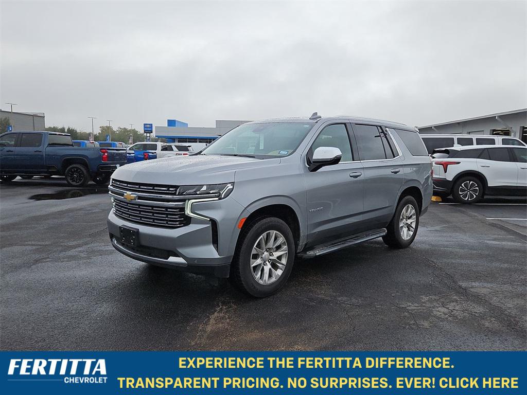 Sterling Gray Metallic 2023 Chevrolet Tahoe Premier RWD 10-Speed Automatic with Overdrive EcoTec3 5.3L V8 Jet Black/Maple Sugar Leather, 10 Speakers, 1st & 2nd Row Color-Keyed Carpeted Floor Mats, 20"" x 9"" Polished Aluminum Wheels, 3.23 Rear Axle Ratio, 3rd Row 60/40 Power-Folding Split-Bench Seat, 3rd row seats: split-bench, 4-Wheel Disc Brakes, ABS brakes, Adaptive suspension, Air Conditioning, Alloy wheels, AM/FM radio: SiriusXM with 360L, Apple CarPlay/Android Auto, Auto High-beam Headlights, Auto-dimming door mirrors, Auto-Dimming Inside Rear-View Mirror, Auto-dimming Rear-View mirror, Auto-leveling suspension, Automatic temperature control, Bose 10-Speaker Centerpoint Surround Audio Sys Ft, Brake assist, Bright Front & Rear Door Sill Plates, Bumpers: body-color, Chrome Door Handles w/Body-Color Strip, Chrome Mirror Caps, Color-Keyed Carpeting Floor Covering, Compass, Delay-off headlights, Driver & Front Outboard Passenger Airbags, Driver door bin, Driver vanity mirror, Dual Exhaust System, Dual front impact airbags, Dual front side impact airbags, Electronic Stability Control, Emergency communication system: OnStar and Chevrolet connected services capable, Enhanced Driver Information Center, Floor Console, Four wheel independent suspension, Front anti-roll bar, Front Bucket Seats, Front Center Armrest, Front dual zone A/C, Front High-Back Reclining Bucket Seats, Front reading lights, Fully automatic headlights, Garage door transmitter, Hands-Free Rear Power Programmable Liftgate, Heated & Ventilated Driver & Front Passenger Seats, Heated 2nd Row Outboard Seats, Heated door mirrors, Heated Driver & Front Passenger Seats, Heated front seats, Heated rear seats, Heated Steering Wheel, Heated steering wheel, Illuminated entry, Infotainment Display, Lane Change Alert w/Side Blind Zone Alert, LED Daytime Running Lamps, License Plate Front Mounting Package, Low tire pressure warning, Magnetic Ride Control Suspension, Memory seat, Memory Settings, Navigation System, Occupant sensing airbag, Outside Heated Power-Adjustable Mirrors, Outside temperature display, Overhead airbag, Overhead console, Panic alarm, Passenger door bin, Passenger vanity mirror, Perforated Leather Seat Trim, Power door mirrors, Power driver seat, Power Liftgate, Power passenger seat, Power Release 2nd Row Bucket Seats, Power steering, Power Tilt & Telescopic Steering Column, Power windows, Preferred Equipment Group 1LZ, Premium audio system: Chevrolet Infotainment 3 Premium, Radio: Chevrolet Infotainment 3 Premium System, Rain sensing wipers, Rear air conditioning, Rear anti-roll bar, Rear Cross Traffic Alert, Rear reading lights, Rear window defroster, Rear window wiper, Remote keyless entry, Remote Start, Roof rack: rails only, Safety Alert Seat, Security system, SiriusXM Radio w/360L, Speed control, Speed-sensing steering, Split folding rear seat, Spoiler, Steering wheel memory, Steering wheel mounted audio controls, Tachometer, Telescoping steering wheel, Tilt steering wheel, Traction control, Trip computer, Turn signal indicator mirrors, Universal Home Remote, Variably intermittent wipers, Ventilated front seats, Voltmeter, Wireless Charging, Wrapped Steering Wheel, Jet Black/Maple Sugar Leather.Recent Arrival!